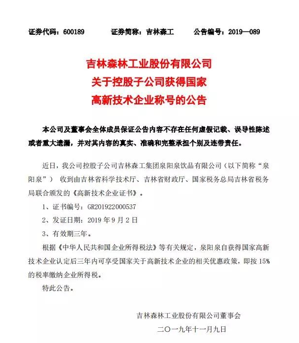 ? ? ? 根據(jù)科學(xué)技術(shù)廳、吉林省財(cái)政廳、國家稅務(wù)總局聯(lián)合頒布的《關(guān)于公布吉林省2019年第一批國家高新技術(shù)企業(yè)認(rèn)定結(jié)果的通知》,經(jīng)過層層審核,吉林森工集團(tuán)泉陽泉飲品有限公司由吉林省科學(xué)技術(shù)廳、吉林省財(cái)政廳、北京市國家稅務(wù)局、國家稅務(wù)總局吉林省稅務(wù)局局聯(lián)合批準(zhǔn)下發(fā)的高新技術(shù)企業(yè)認(rèn)定。